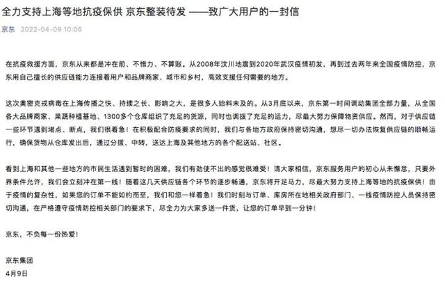 京東一直在行動4月9日,京東發(fā)布了《全力支持上海等地抗疫保供 京東整裝待發(fā) ——致廣大用戶的一封信》表示:從3月底以來,京東第一時間調(diào)動集團(tuán)全部力量,從全國各大品牌商家、果蔬種植基地、1300多個倉庫組織了充足的貨源,同時也調(diào)撥了充足的運力,盡最大努力保障物資供應(yīng)。